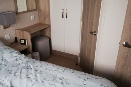 This is the main bedroom of the caravan which holds a king size double bed. There are ample storage areas above and below the bed ( the mattress lifts up for under bed storage). There is also a full size wardrobe and a door leading to the en-suite. and a dressing table area. This also has plenty of points and more USB connections.